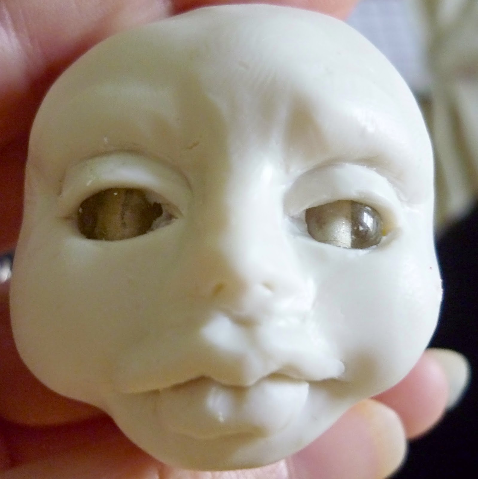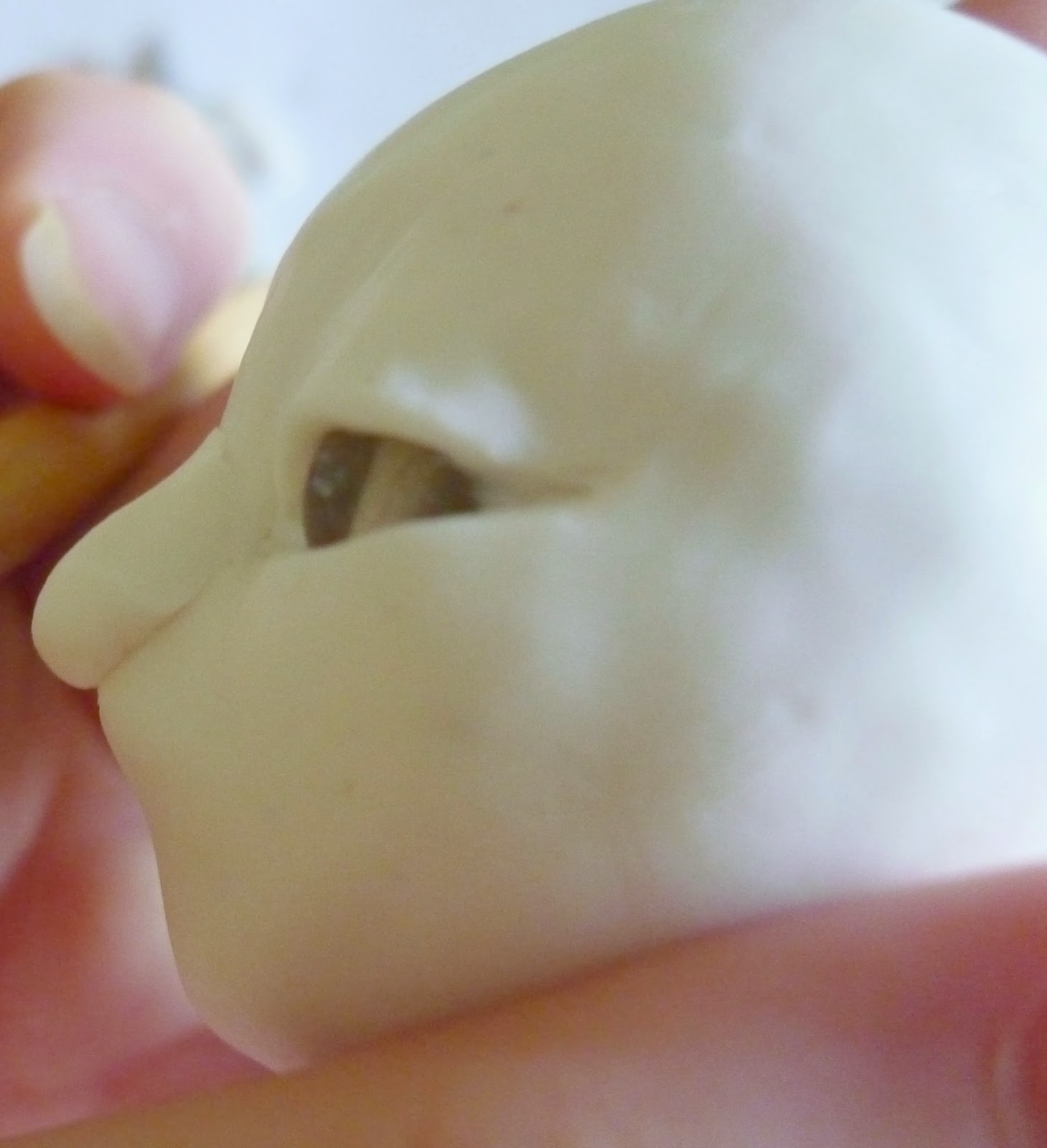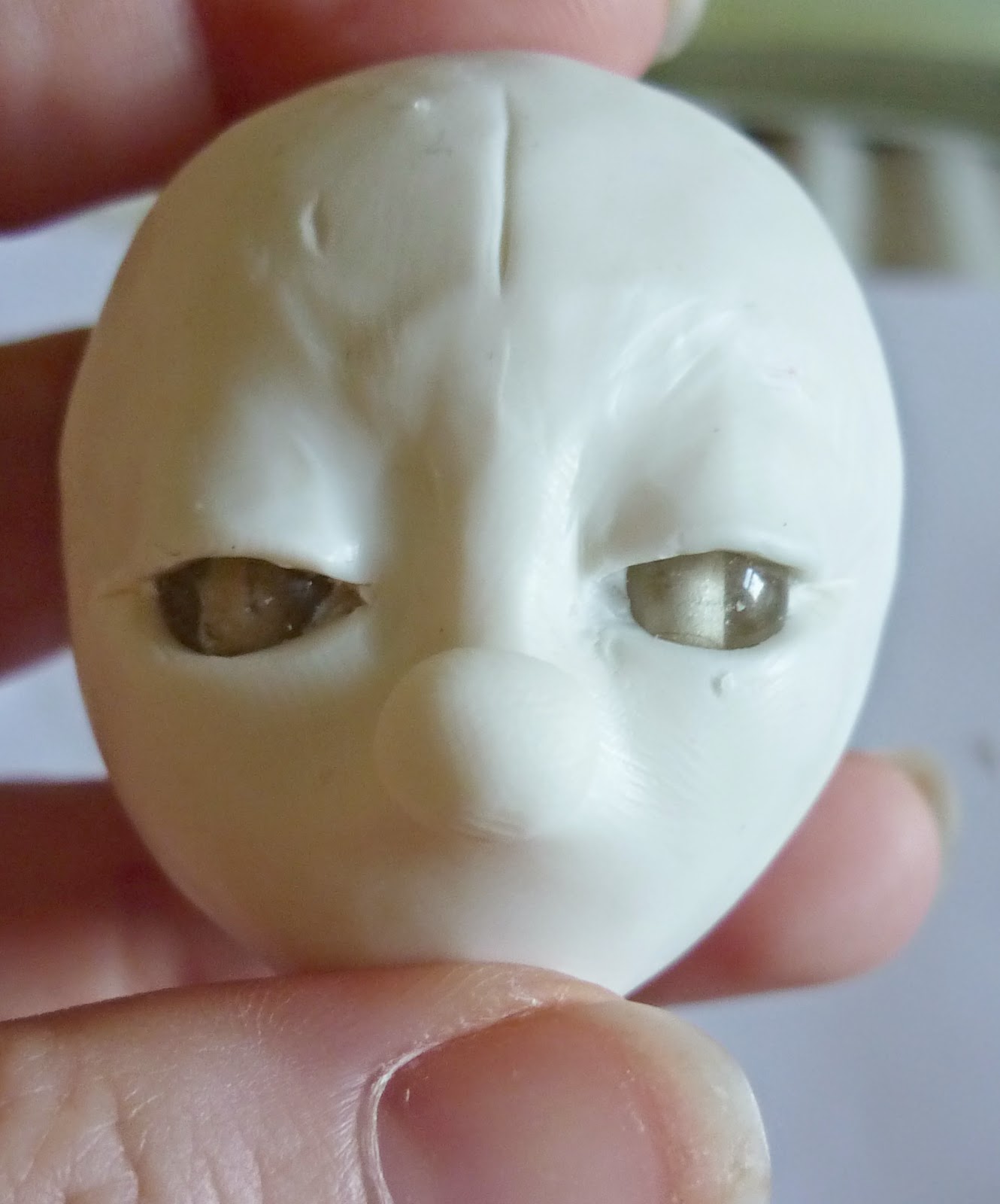 And begin to blend the clay into the head, pushing upwards on the upper lid and down on the lower lid to open the eyes up a bit.