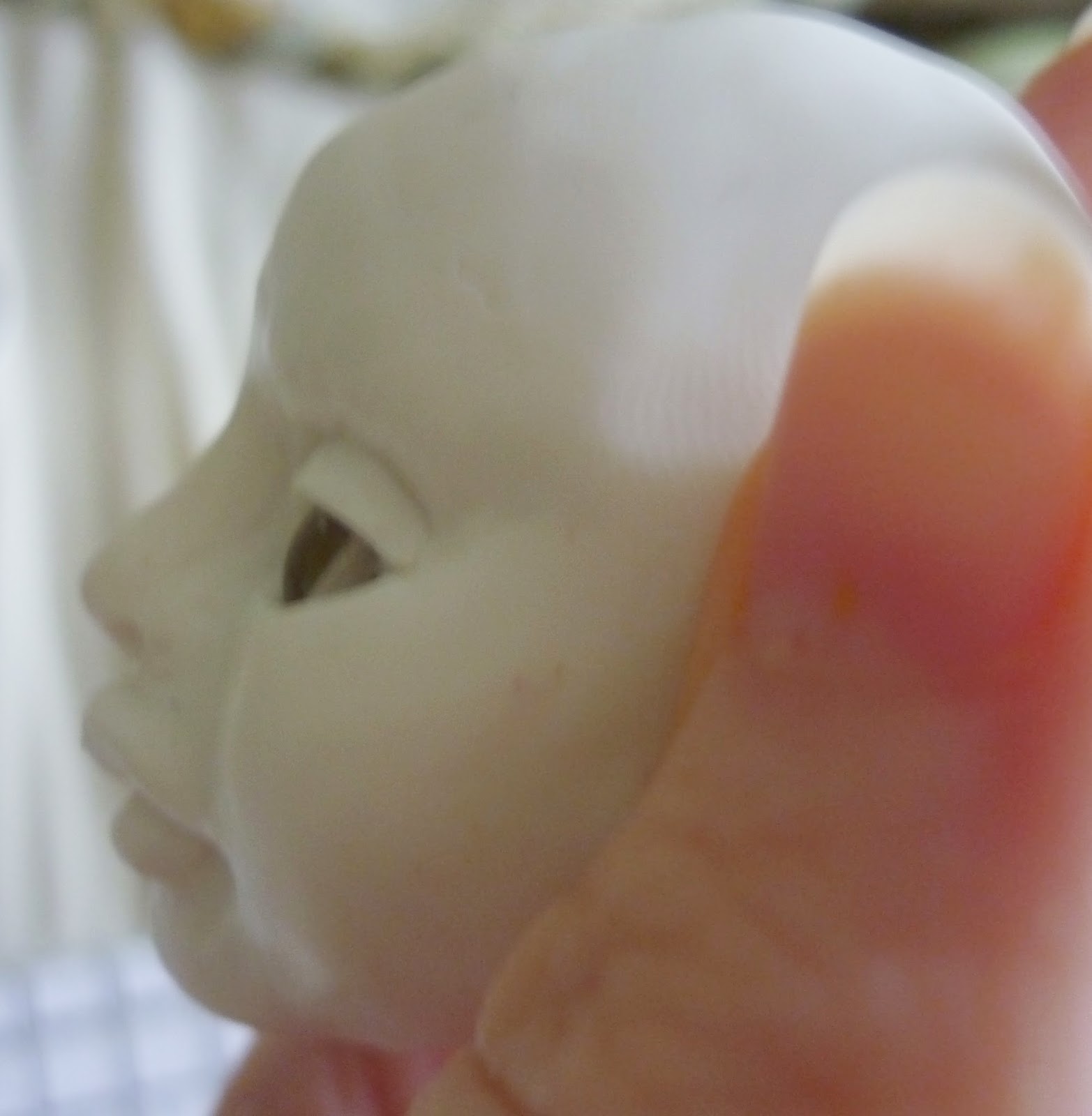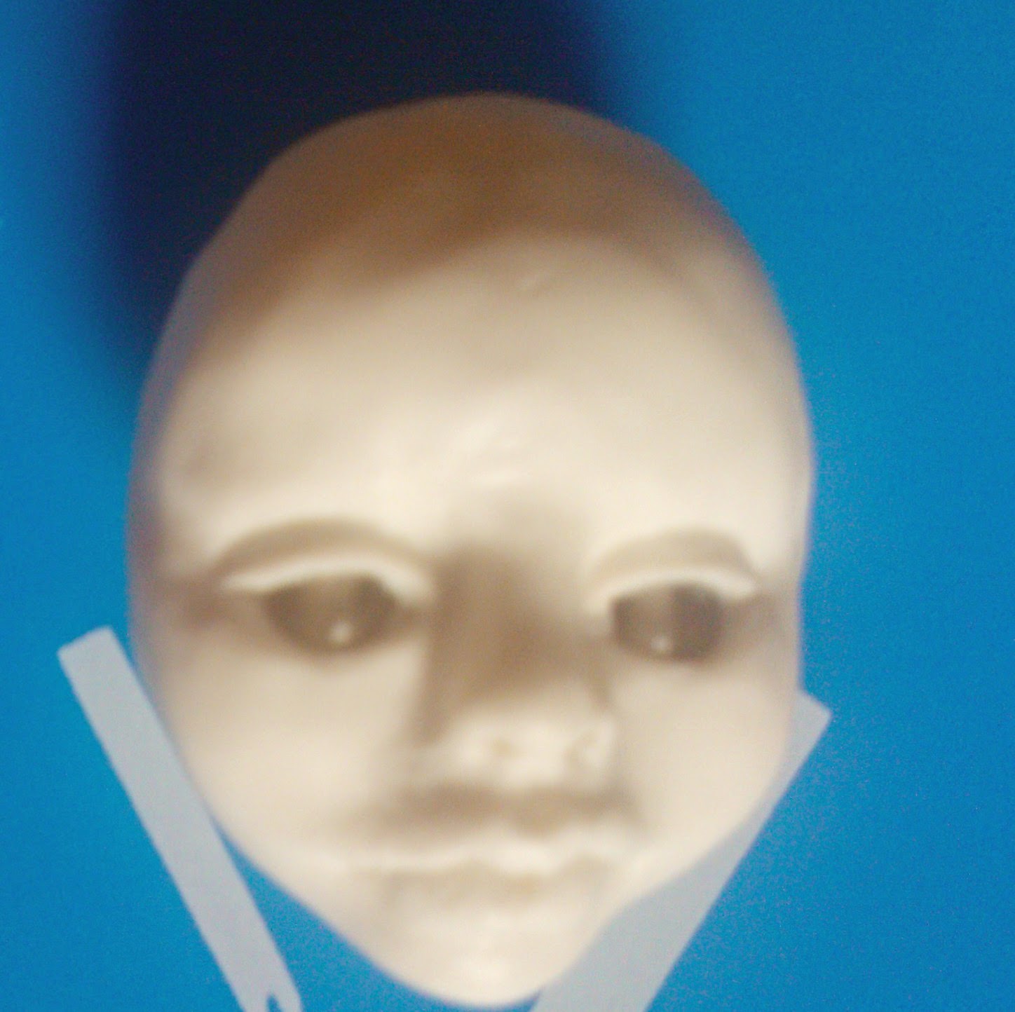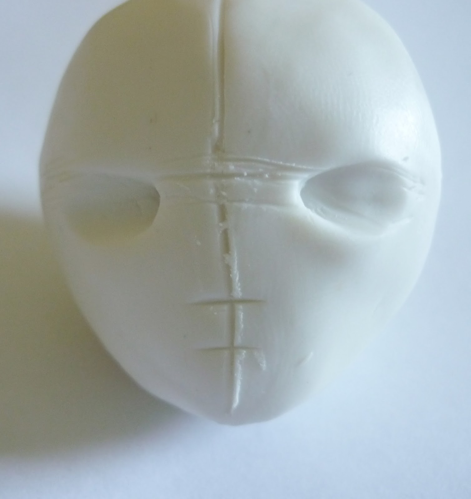 And begin to blend the clay into the head, pushing upwards on the upper lid and down on the lower lid to open the eyes up a bit.