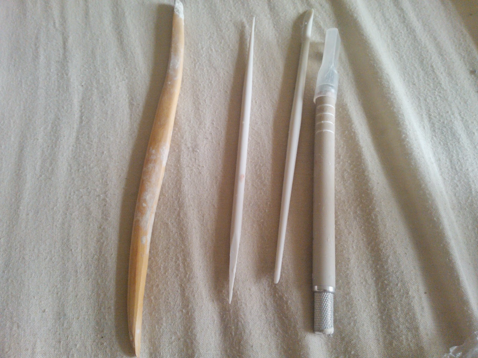 These are the tools I used for sculpting this doll. A wooden tool and two small plastic sculpting tools. I also have my craft knife for removing any bits that get in the clay.